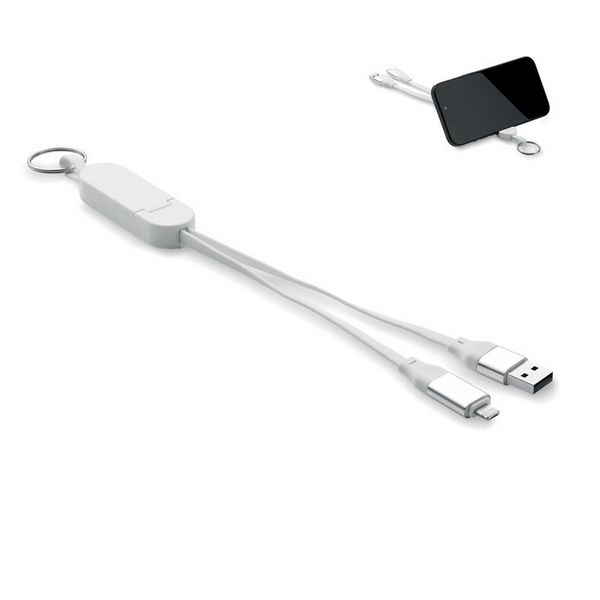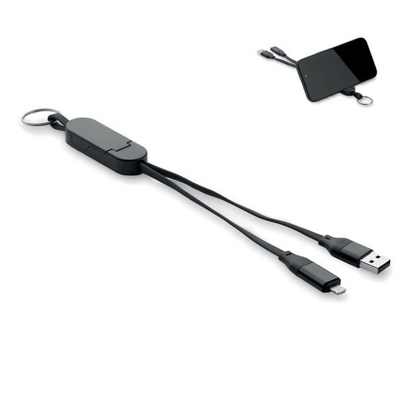 Kabel od 60 W u kućištu od reciklirane ABS plastike s privjeskom za ključeve i stalkom za telefon. Ulaz: 2-u-1 Type-C i Type-A. Izlaz: Type-C i micro-B (2 u 1 pin). Duljina kabela: 26 cm.
