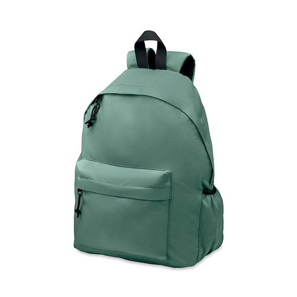 Ruksak od 600D RPET poliestera s vanjskim džepom s patentnim zatvaračem. Podstavljena leđa i bočni pretinac za bocu.