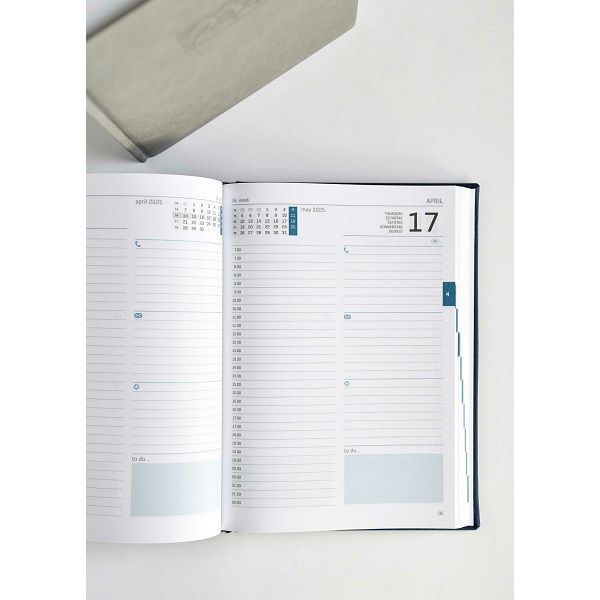 "Opis proizvoda:320 strana\nPrvi dio sadrži osnovne podatke, godišnji planer za tekucu godinu, drugi dio sadrži planer na 314 strana, treci dio sadrži godišnji planer za sljedecu godinu\ndimenzija: 16,5 x 22,5 cm\njezici: HR, GB\nvrsta papira:  80 g/m2 listovi\ntisak:  dvije boje (siva, plava)\nuvez: tvrdi uvez - šivani, pokazna vrpca\nKorica je mekana i izradena je od termolabilnog matreijala\npreporucena vrsta tiska: sitotisak, suhi žig, foliotisak, termotisak, UV tisak