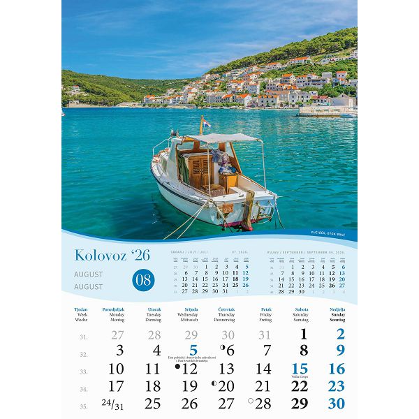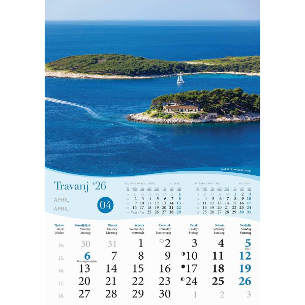 Opis proizvoda:13 listova\ndimenzija: 30,5 x 50 cm \nprostor za dotisak: 30,5 x 7 cm\nopis: tromjesecni kalendarij,vrecica\jezici: HR, GB, IT\nvrsta papira: KD 135 g/m2 listovi, 350 g/m2 podloga \nuvez: spiralni\npakiranje: 50 kom