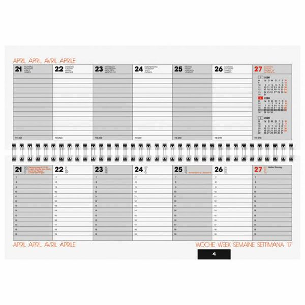 dimenzija: 297x 105 mm; izraden je od prirodnog kartona od konoplje; svake dvije stranice predstavljaju jedan tjedan; tiskane oznake za mjesece na donjoj uzdužnoj strani; tekst na: engleskom, njemackom, francuskom i talijanskom; dnevna raspodjela je od 7 do 19 sati s oznakama za sate; sadrži 2 stranice mjesecnog plana za trenutnu godinu i 2 stranice za sljedecu godinu;spiralni uvez; ukupno ima 112 stranica