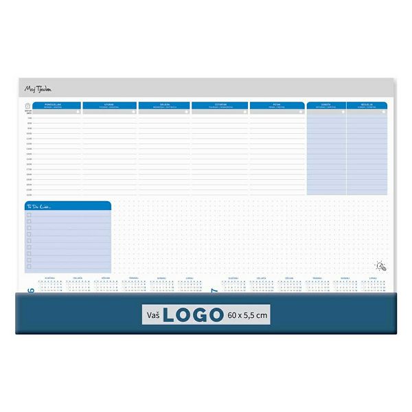 Opis proizvoda:96 strana\ndimenzija: 60 x 40 cm \nprostor za dotisak: 5,5 x 60 cm\nopis: svaki list sadrži kalendar za tekucu i sljedecu godinu ( 2024 i 2025)\njezici: HR, GB, DE\nvrsta papira: 80 g/m2 listovi, 300 g/m2 podloga \nuvez: ljepljeno gore, PVC klapna dolje \npakiranje: 15 kom