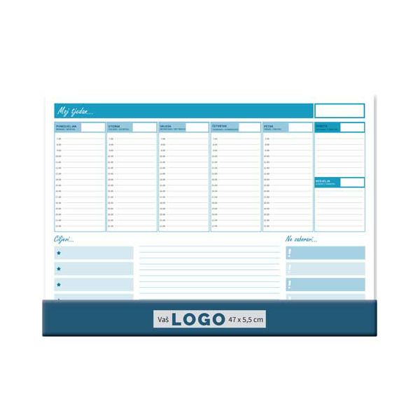 Opis proizvoda:96 strana\ndimenzija: 47 x 34 cm \nprostor za dotisak: 5,5 x 47 cm\nuz svaku mapu dolazi i ravnalo s kalendarom (karton, plastificirano)\njezici: HR, GB, DE\nvrsta papira: 80 g/m2 listovi, 300 g/m2 podloga \nuvez: ljepljeno gore, PVC klapna dolje \npakiranje: 20 kom