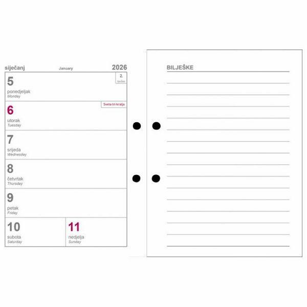 posebne rupe od 4,5 cm; tjedan na jednom listu, na drugom za bilješke