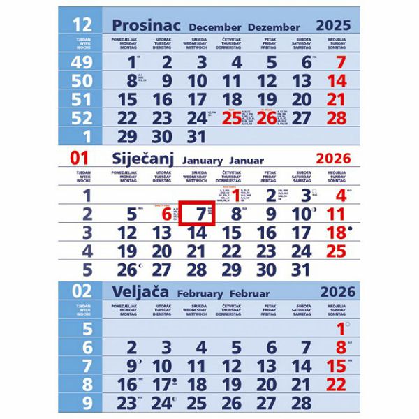 KALENDAR ZIDNI TRODIJELNI PLAVI - NESPIRALIRANI