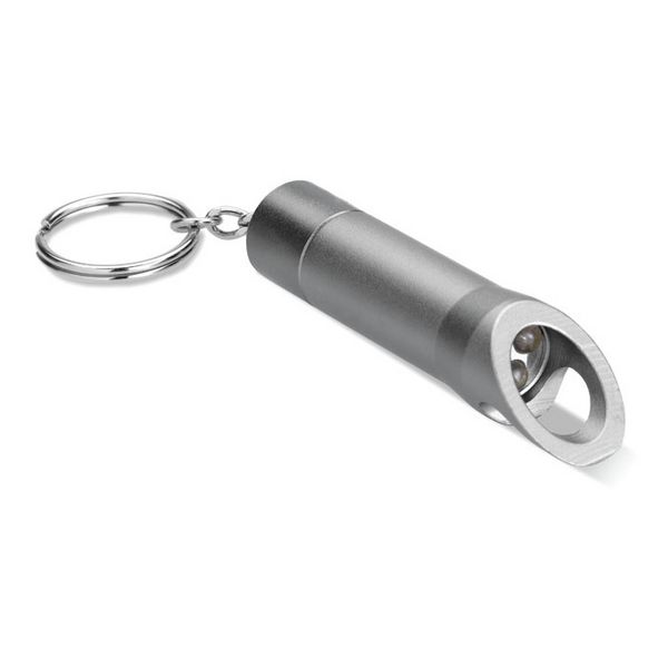 Metalni privjesak za ključeve u obliku LED svjetiljke s otvaračem za boce. Uključene 3 baterije.
